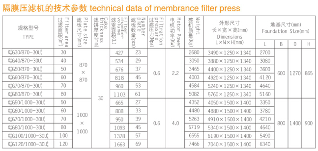 隔膜壓榨壓濾機(jī)由隔膜板和廂式濾板排列組成濾室,在輸料泵的壓力作用下將漿料輸入濾室,通過過濾介質(zhì)(濾布)將濾料中的固體和液體分離,當(dāng)漿料中的固體形成餅后,再向隔膜通入空氣,對(duì)濾室內(nèi)的固體充分壓榨,降低含水率。對(duì)于粘性物料的過濾及對(duì)含水率要求較高的用戶,此機(jī)更有其獨(dú)特的特性。